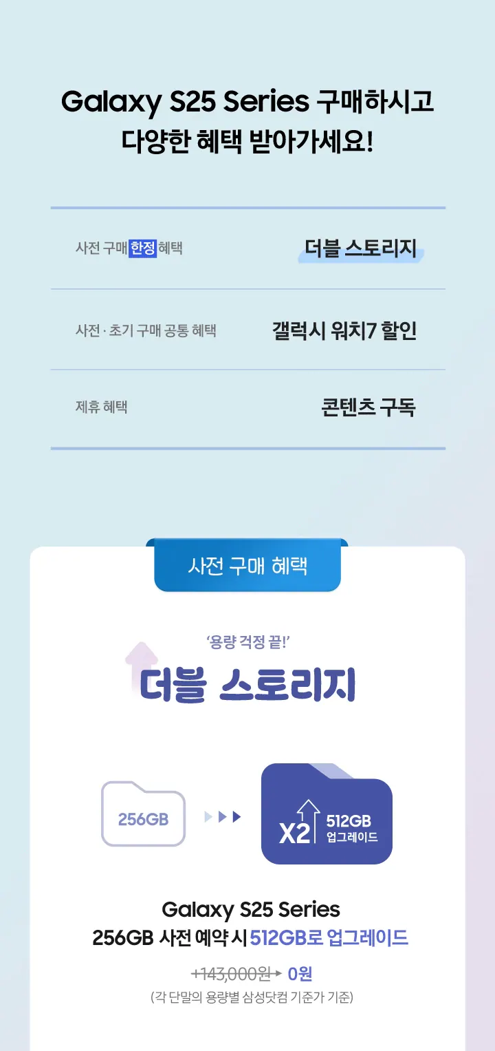 답변: 기본 저장공간 업그레이드, 갤럭시 워치7 할인 쿠폰, 삼성 멤버십 포인트 추가 적립 등의 혜택이 있습니다.